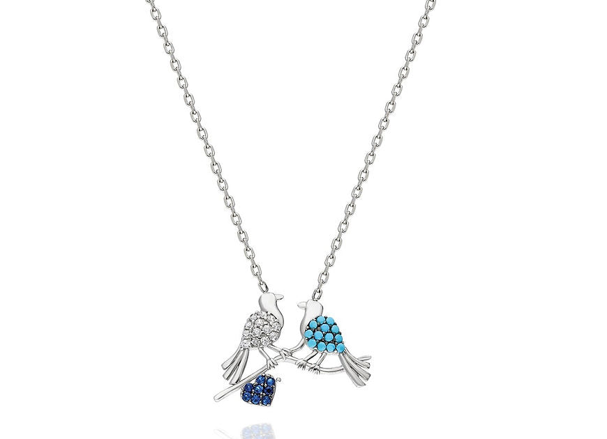 The Two silver bird pendant with blue and white rhinestones, sitting on a branch with a small blue heart symbolises a promise of love never to be broken. The beautiful Birds and little blue Heart makes you look unique!!