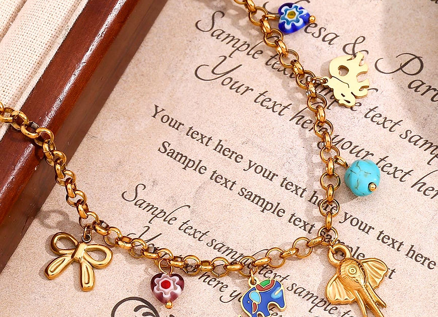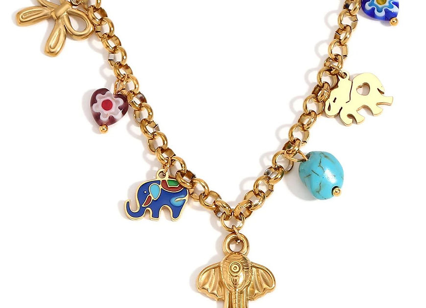 Colossus Gajah Multi Charms Necklace is a 18K gold Plated chain necklace with various charms, including Ganesha, elephants, a bow, a flower, and a heart, lays on a tan surface.