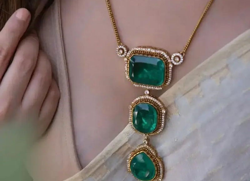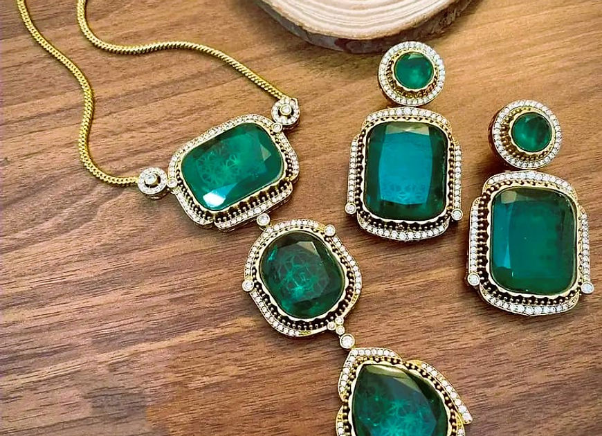 Dheemayi Green Stone statement Necklace Set is Meticulously designed Golden Plated Green Stone and CZ stone embolished set with Delighted an timeless accessory that embodies the everlasting Fashion Jewelry Piece!! Adore yourself with this beautiful Mithya statement Necklace Set!!